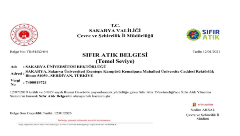 Bu uygulamalar sayesinde Sakarya Üniversitesi, Çevre, Şehircilik ve İklim Değişikliği Bakanlığı tarafından Sıfır Atık Belgesi almaya hak kazanmıştır.